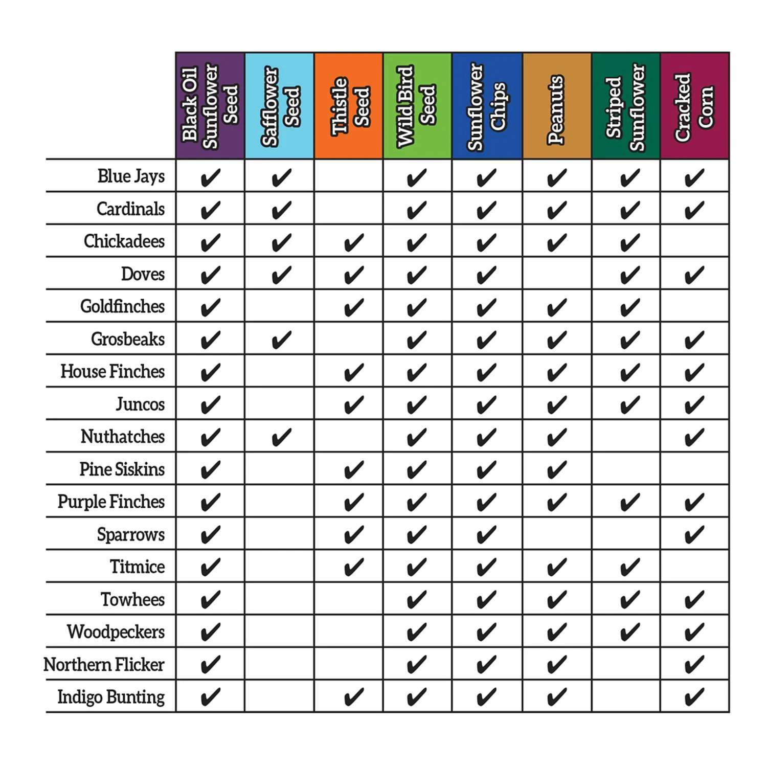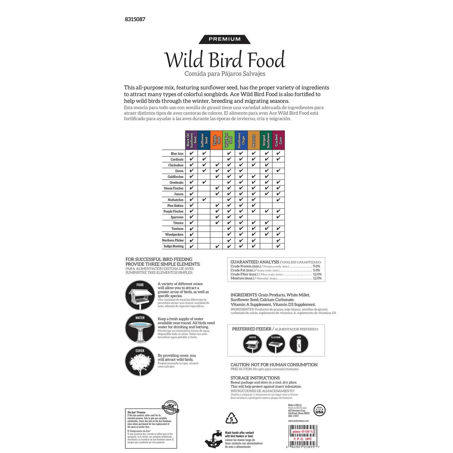 ACE premium wild bird food is an all-purpose mix, featuring sunflower seed and has the proper variety of ingredients to attract many types of colorful songbirds. Ace wild bird Food is also fortified to help wild birds through long winter, breeding and migrating seasons. Vitamins and minerals have been added to the mix Helps wild birds through long winters and times of stress brought on by breeding and migration Mix attracts bluebirds, cardinals, chickadees, grosbeaks, blue jays, nuthatches, finches, sparrows and other desirable birds Rich in sunflower and white millet Strong, puncture resistant polywoven bag keeps product fresh Suggested feeders – hopper, platform, tube Crude protein (min) 8.5 percent, crude fat (min) 4.5 percent, crude fiber (max) 10.0 percent, moisture (max) 12.0 percent