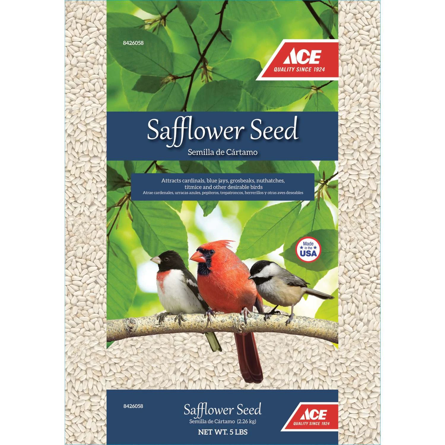 Safflower seeds are the preferred seed of the larger birds, the classic Cardinal, the beautiful Blue Jay and Doves however, smaller birds find this seed to their liking. ACE Safflower Seed is very effective when used by itself or in a mix. This is an energizing grain with very high oil content. Most importantly the squirrels are not attracted to the bitter taste and odor of the safflower seed which helps deter them from your feeders. Helps discourage squirrels from eating Attracts cardinals, blue jays, grosbeaks, nuthatches, titmice and other desirable birds Barrier packaging helps to keep food fresh and tasty