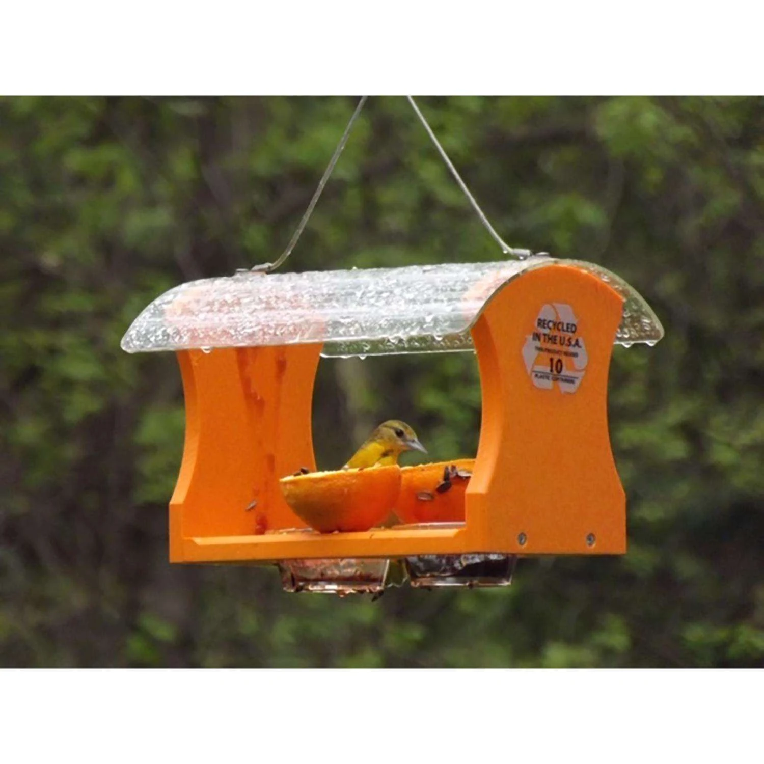 Attract beautiful orioles to your yard with this vibrant oriole feeder made from orange recycled poly-lumber. Stainless steel screws. Comes with two removable cups to dispense grape jelly-orioles’ favorite jelly flavor and two pegs for orange halves. Thick heavy duty clear acrylic roof allows orioles to see the food and protects feeder from rain Cups may also be used to dispense mealworms for bluebirds Comes with hanging cable