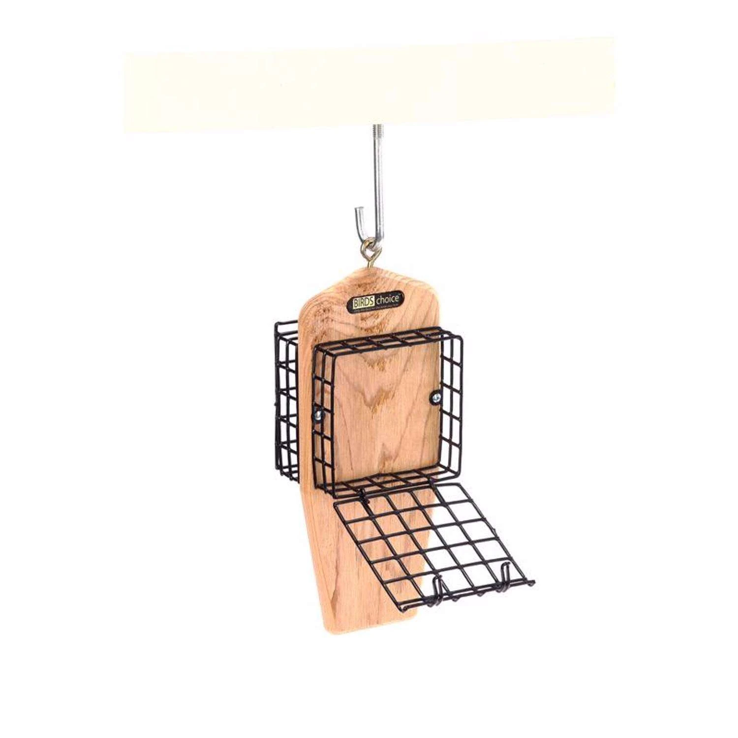 This Birds Choice suet feeder is made from quality cedar, will hold two suet cakes and has a tail prop to help woodpeckers feed more comfortably. Natural cedar suet feeder Easy to open suet cages, 2 suet capacity Eye hook attached so feeder is ready to hang Tail prop to rest birds tails and used like a lever to feed on the suet