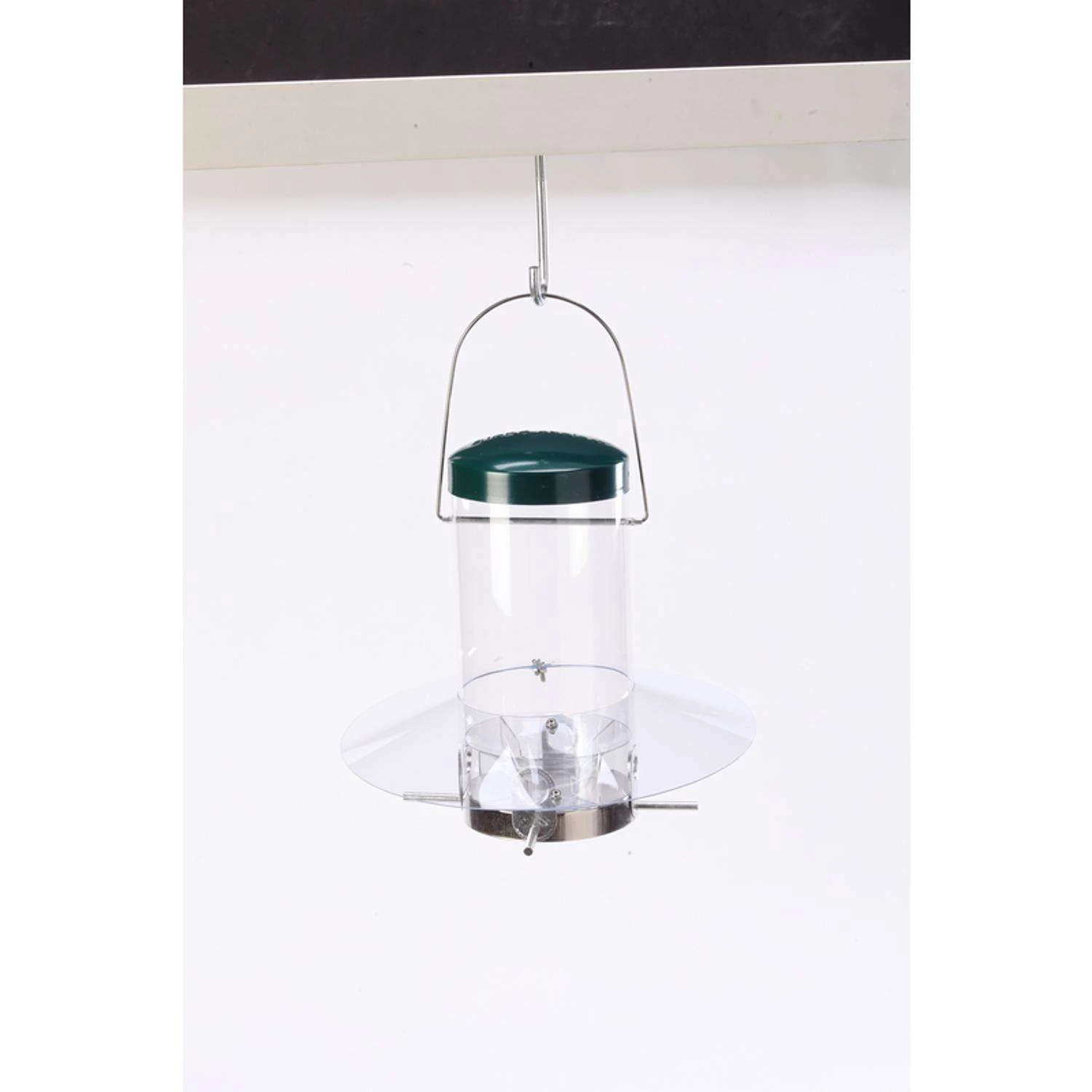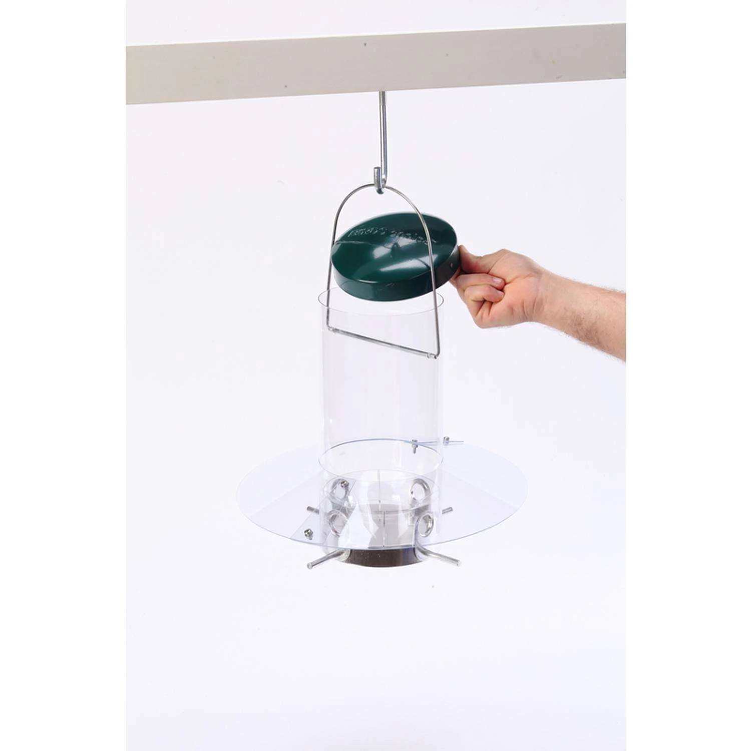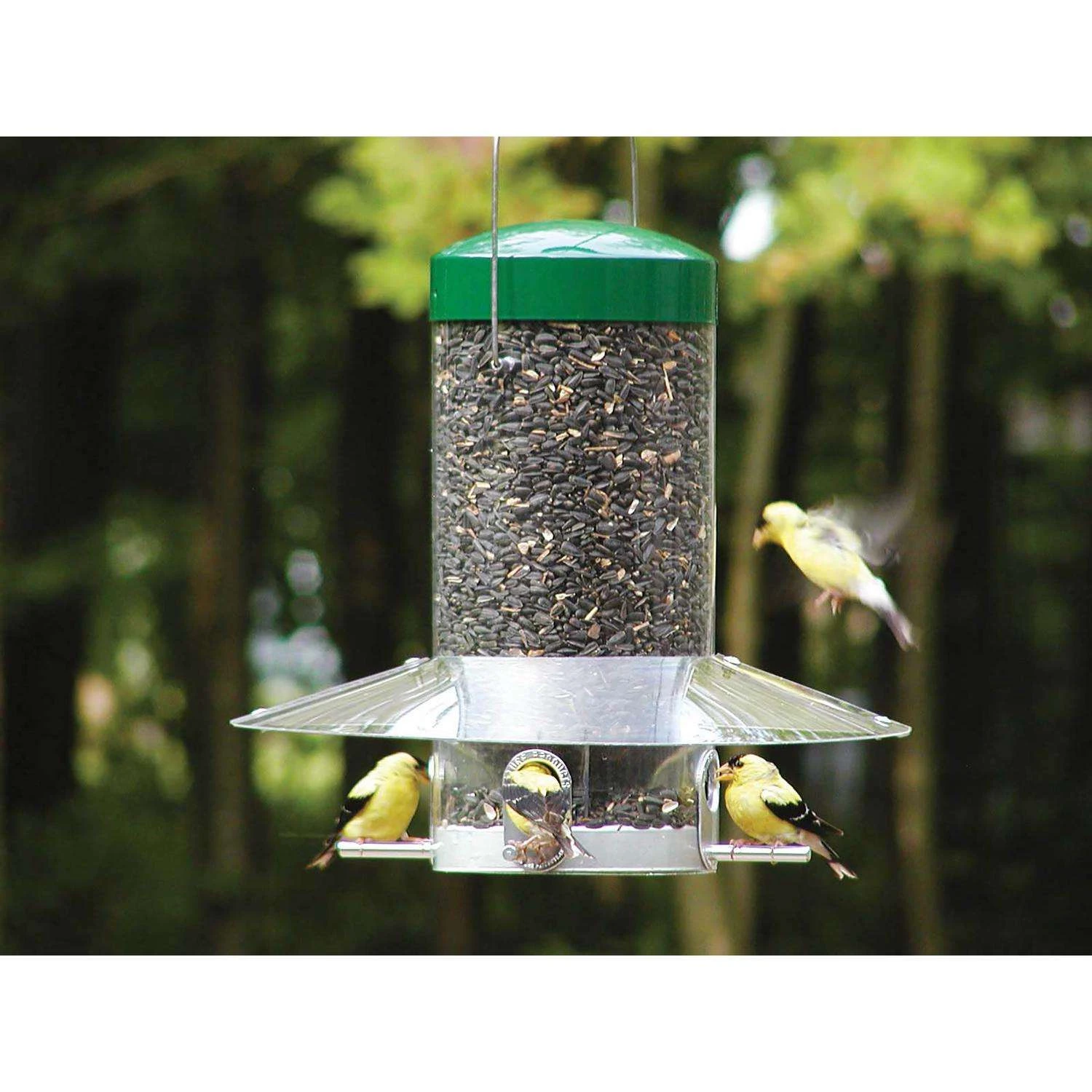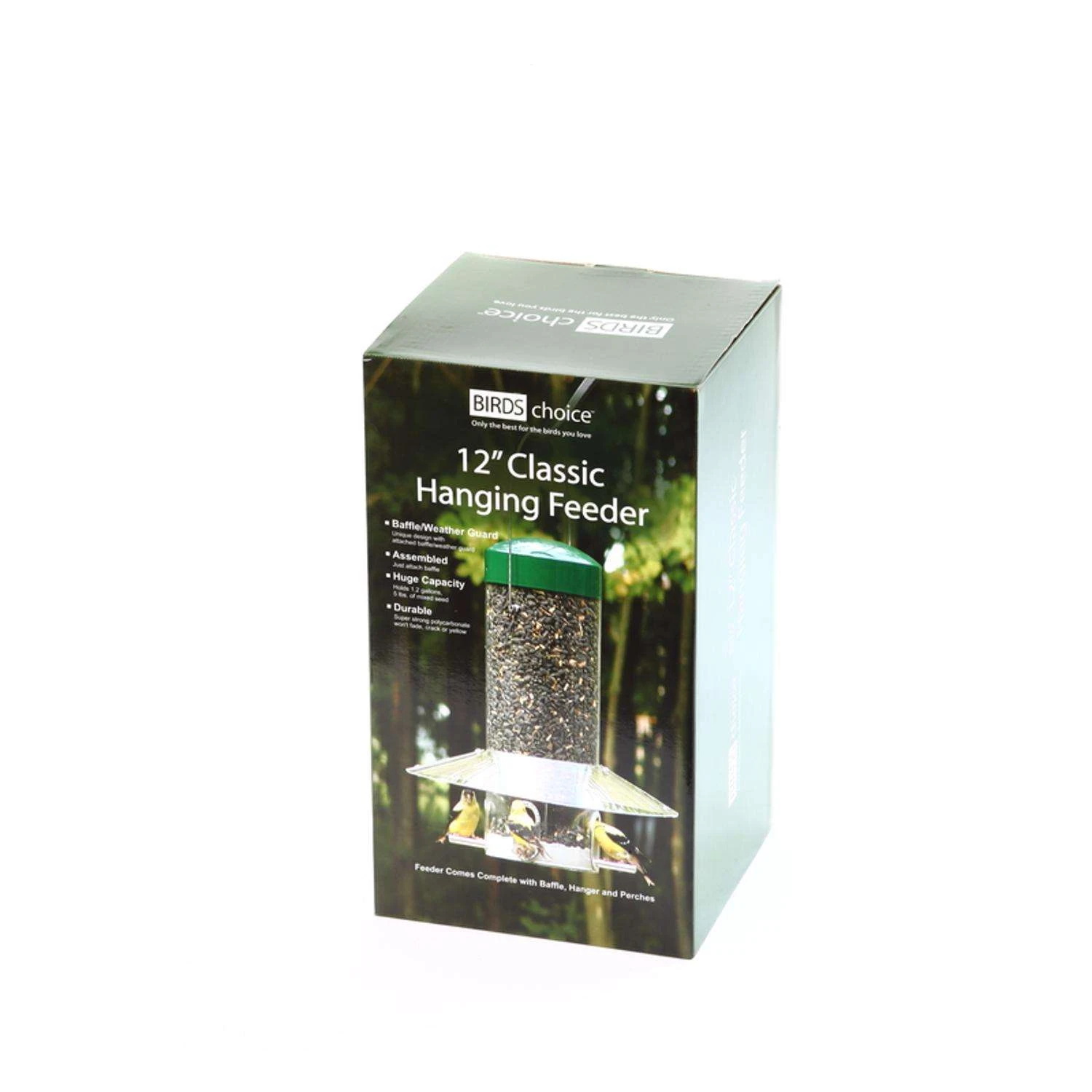 This 12 inch Classic hanging bird feeder features a large reservoir made from UV resistant polycarbonate. Our classic feeders have been tested in the field for over 30 years. Baffle/weatherguard is made from 100% polycarbonate and protects seed from rain and snow It can also help keep larger birds away if desired by lowering it closer to the ports 4 aluminum seed ports and perches Green baked enamel coated top will ensure years of dedicated use Metering ring to distribute the seed to the ports For best results, maintain a seed level of 3-4 inches
