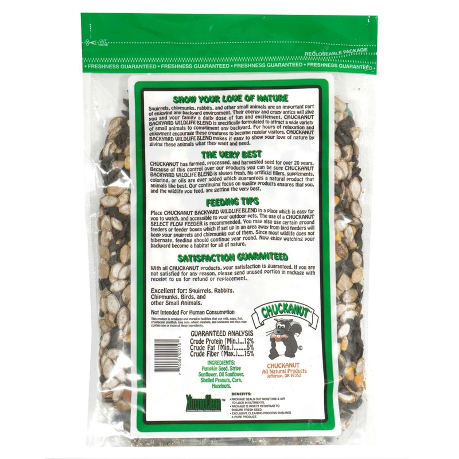 Chuckanut all natural products offer you a single source for seed blends, fortified seed blends, suets, feeders and more. Our product family includes Chuckanut Wildlife Products, Nature’s Nuts Wild Bird Products and Paradise Found Companion Animal Products. Chuckanut’s extensive experience in human consumption foods make a world of difference in our products. Our XtremeClean exclusive five-stage cleaning process eliminates dust and foreign material in all the seed we package. Attracts squirrels, chipmunks, rabbits, blue and stellars jays Chuckanut squirrel feeder, hopper, chalet, bowl feeder type Nutrient-lock package Reclosable bag No artificial color Gourmet food blended to satisfy all of your backyard visitors Super premium blend of seeds and nuts
