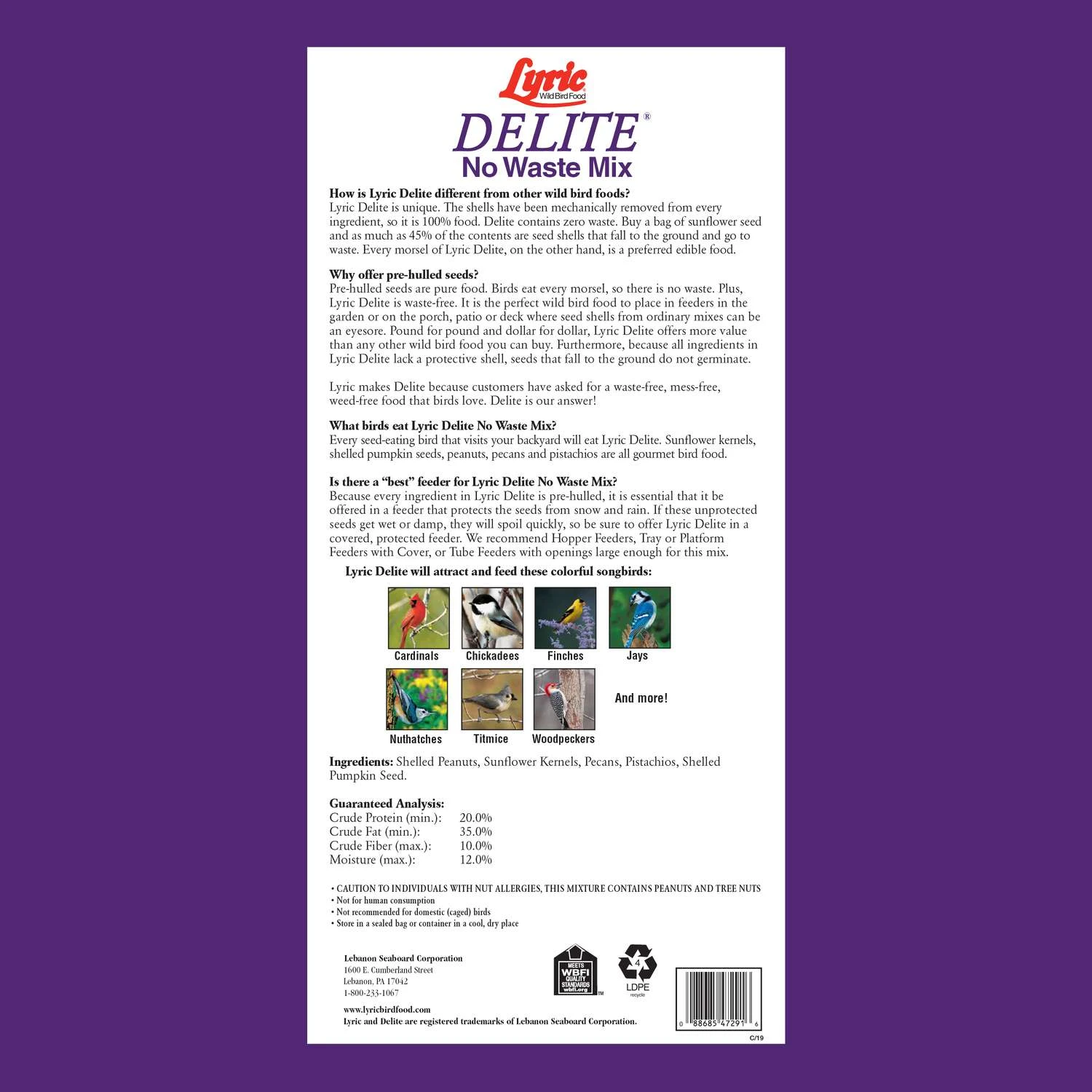 Lyric Delite high protein wild bird mix means no waste at your bird feeder. It’s also a great value, because you don’t pay for the shells. Twenty pounds of Delite Wild Bird Mix is equivalent to nearly 40 pounds of the same mix with the shells. You no longer need to worry about bird seed germinating and causing a mess under the feeder, simply resolve the problem by changing your seed. The Delite Mix is waste-free, mess-free and weed-free and wild birds love it. No waste mix with pre-hulled seeds is pure food for the birds Attracts a wide variety of wild birds such as buntings, chickadees, woodpeckers and finches Use with a feeder that protects the mix from the elements Birds enjoy every morsel