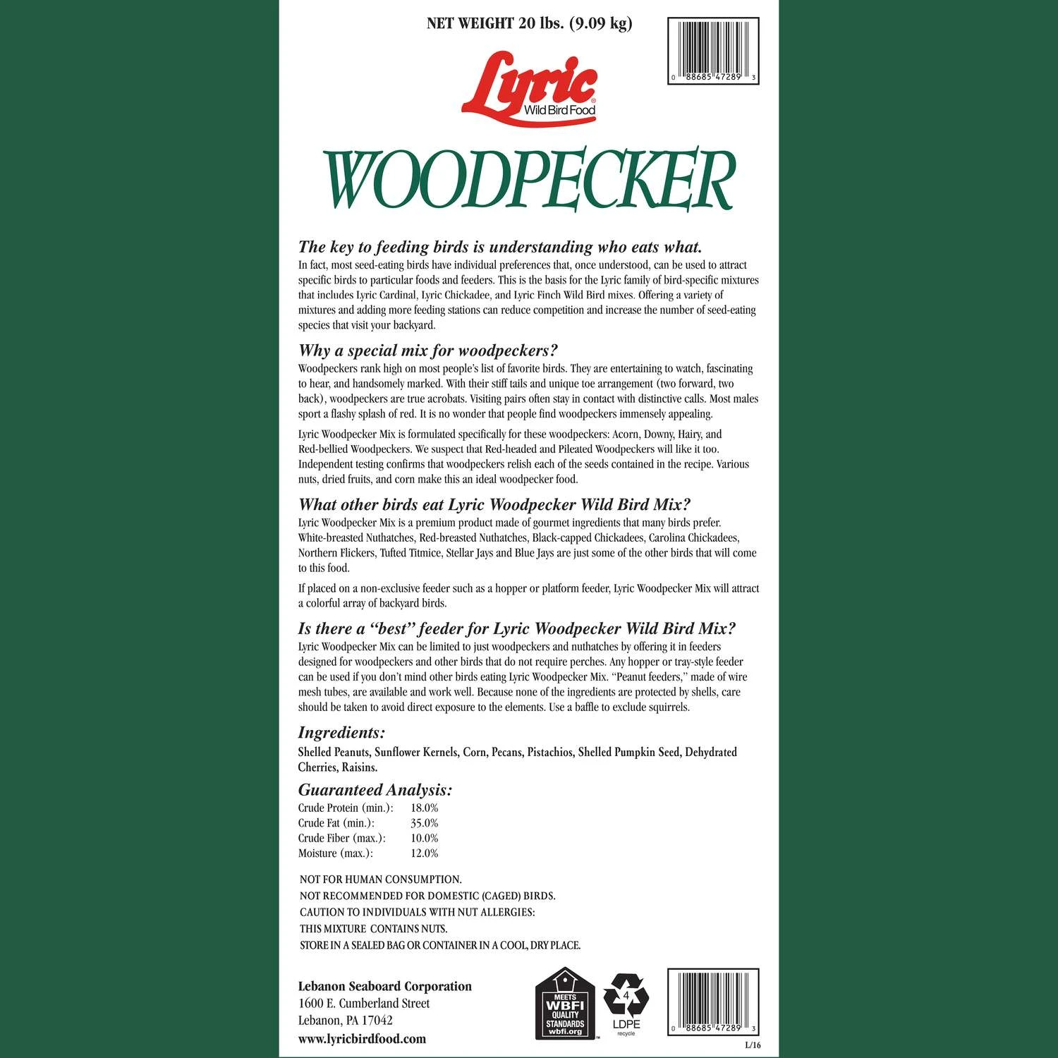 Woodpeckers, with their bright markings, recognizable calls and feeding antics, are some of the most popular birds. Lyric woodpecker no waste bird mix is designed to help with just that. Each ingredient has been tested and it’s a fact shelled peanuts, tree nut pieces, shelled pumpkin seeds, dried fruits and whole kernel corn make an ideal woodpecker food. Special mix of nuts, fruits and sunflower seeds that woodpeckers love Lyric premium blends attract more birds to your backyard feeder Excellent source of protein and fat for wild birds Ideal for woodpeckers, jays, nuthatches, chickadees and more