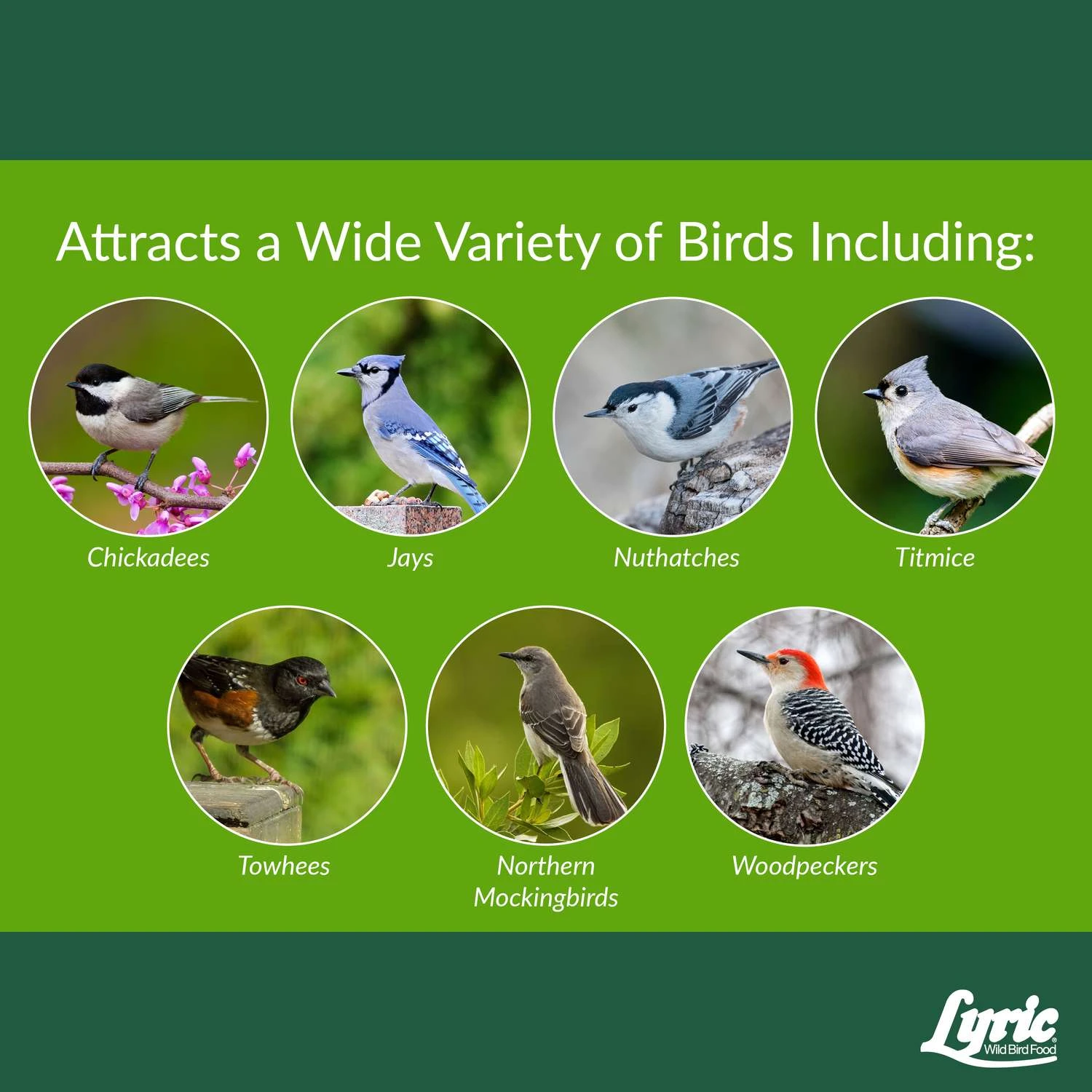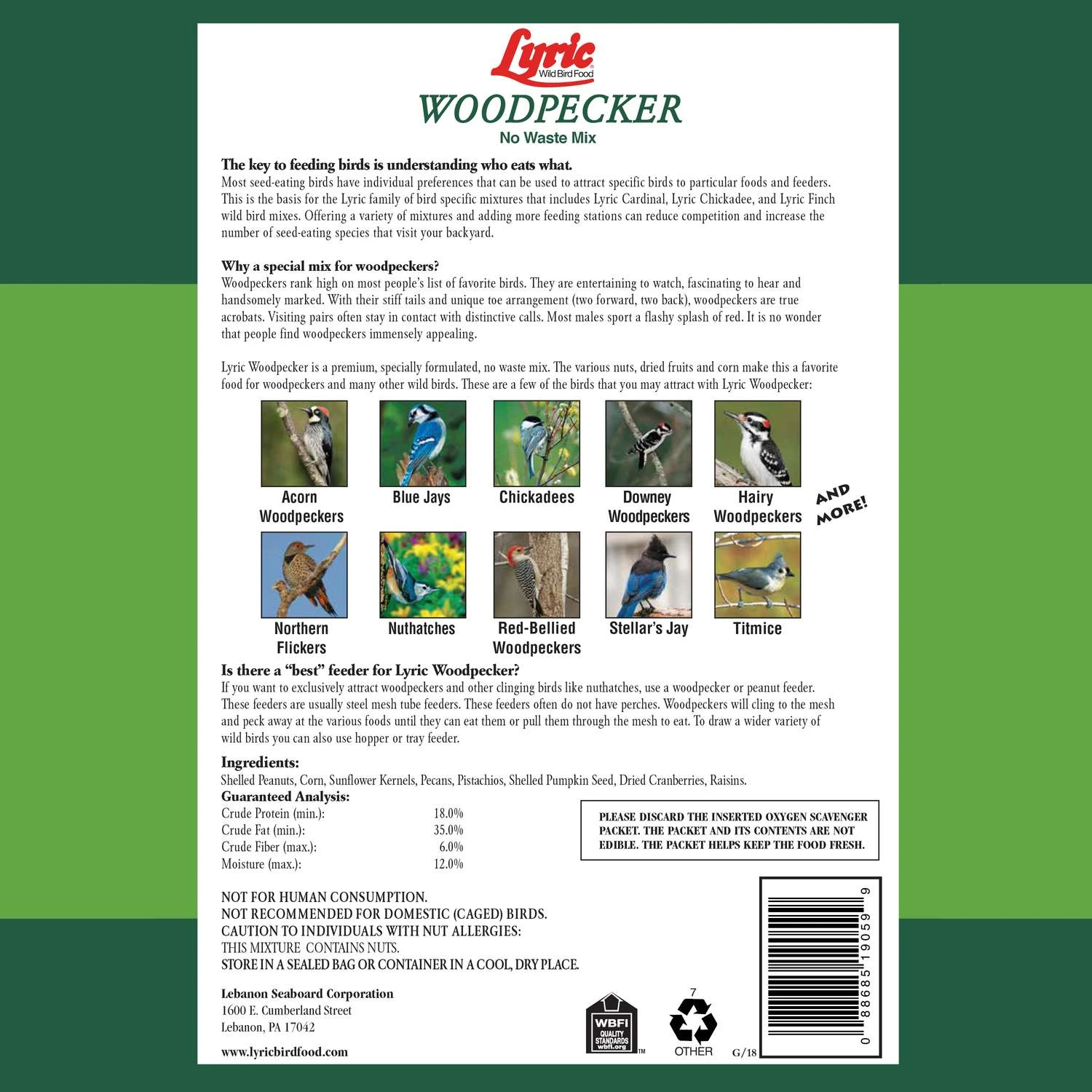 Woodpeckers, with their bright markings, recognizable calls and feeding antics, are some of the most popular birds. You can attract woodpeckers to your yard by just knowing what they prefer to eat. Lyric Woodpecker No Waste Bird Mix is designed to help with just that. Each ingredient has been tested and it’s a fact shelled peanuts, tree nut pieces, shelled pumpkin seeds, dried fruits and whole kernel corn make an ideal woodpecker food. Special mix of nuts, fruits and sunflower seeds that woodpeckers love Stay fresh technology inside Excellent source of protein and fat for wild birds Ideal for woodpeckers, jays, nuthatches, chickadees and more