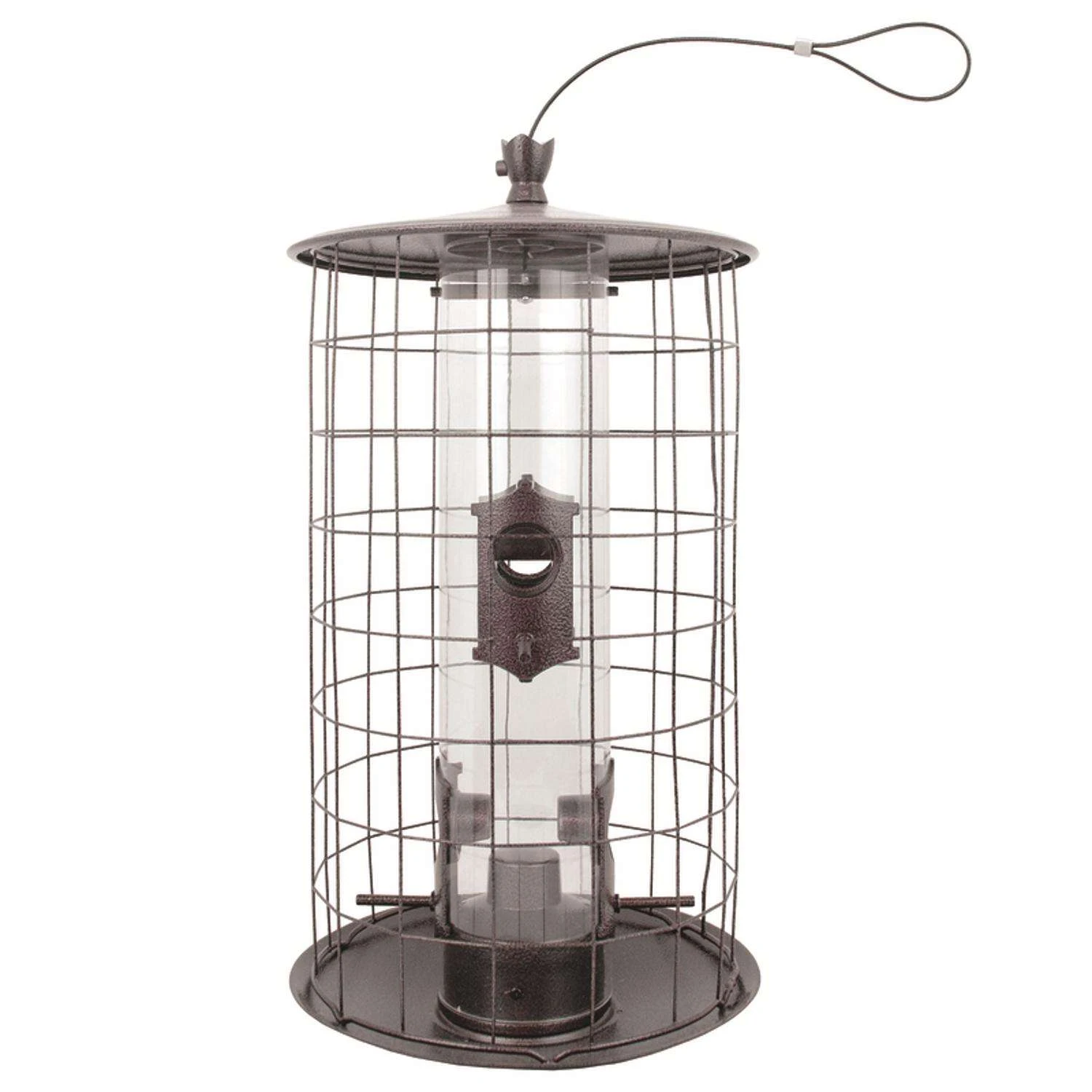 The Perky-Pet the preserve feeder features a decorative metal top, feeding ports, perches and holds up to 3 lb of seed. The patented, diamond-shaped barrier allows birds in and keeps squirrels out. Metal barrier, cap and base resist squirrel damage Seed catching tray keeps seed off the ground Clear, shatter-resistant plastic reservoir for easier seed level monitoring