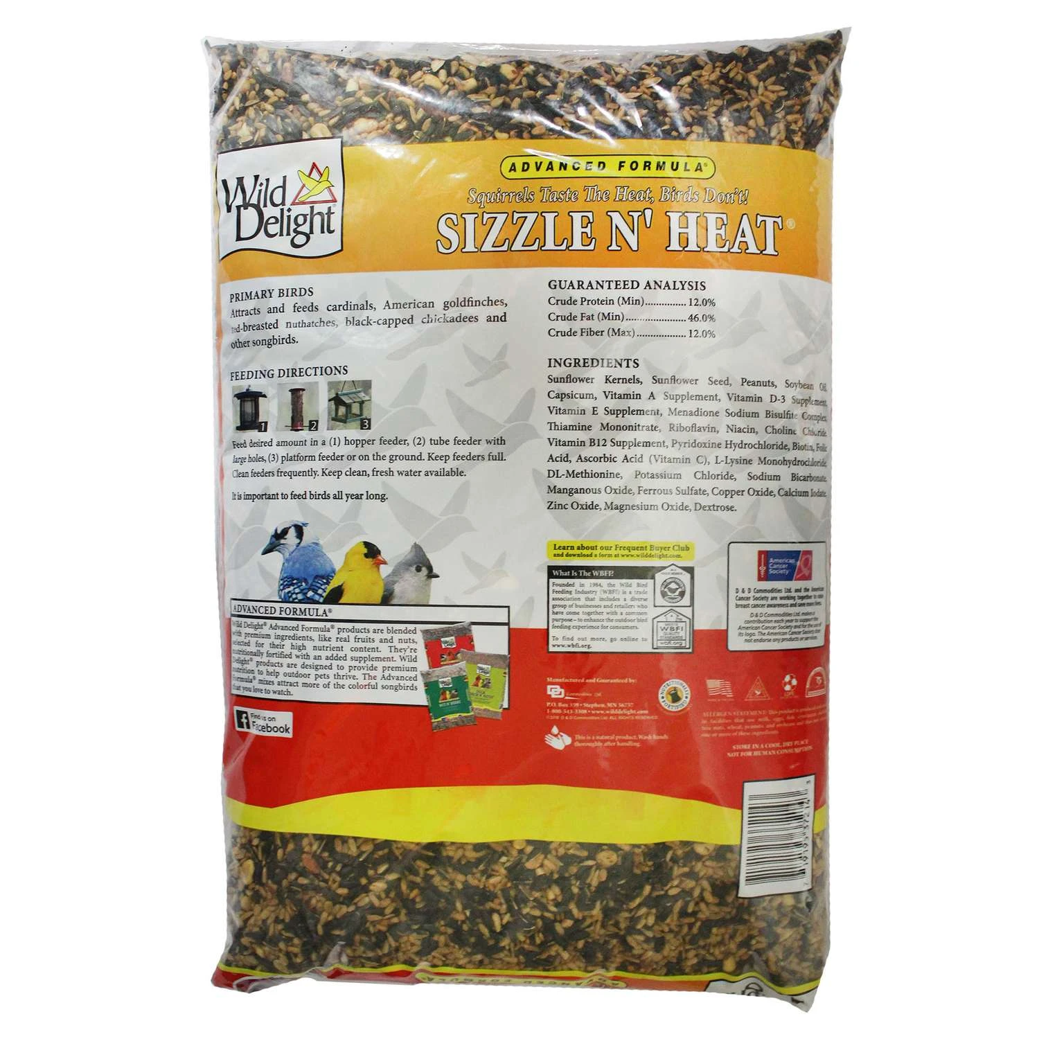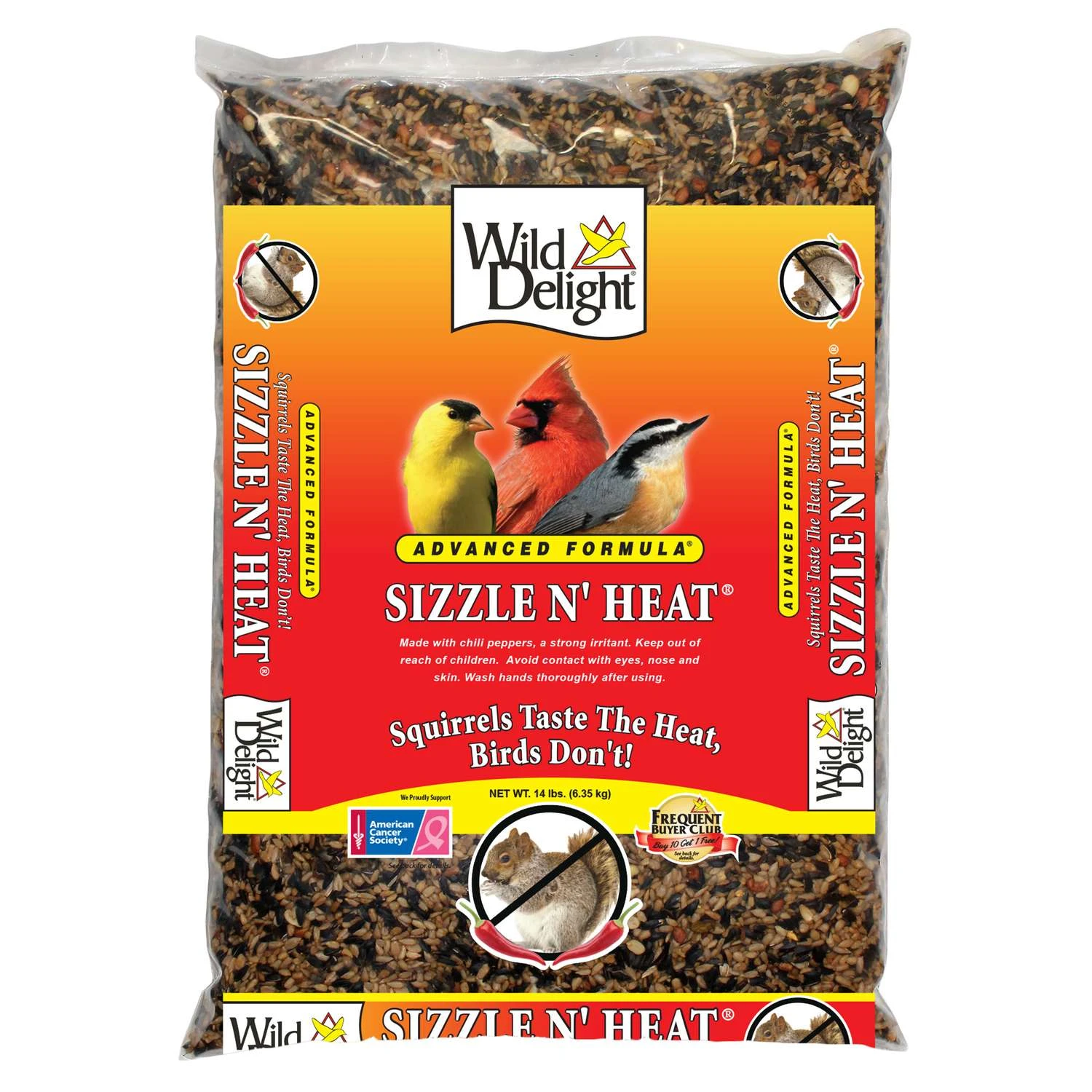 A premium hot blend designed for birds only. Industry studies show that squirrels are listed as the reason for people leaving the bird feeding category. After much development and product testing, we created Sizzle N’ Heat, a squirrel-deterrent product. While this is not a squirrel-proof product, our studies showed it to be a very effective squirrel deterrent. While squirrels may still visit and feed at feeders, once they get a taste of the hot seeds, most will look for other sources of food. As with any Wild Delight product, ensuring the best bird feeding experience is the goal. So Sizzle N’ Heat is filled with the same highly desired ingredients birds love with none of the filler ingredients. Suitable Feeder Type for Hopper, On the Ground, Platform, Tube. 12% max crude fiber, 12% min crude protein, 46% min crude fat Advanced formula that birds will enjoy Made with chili peppers, a strong irritant Squirrels dominate feeders, create a mess and eat much of the seeds, nuts and fruits Natural pepper source acts as a squirrel deterrent Packed with wholesome nuts that most desirable birds crave No fillers like millet, milo and corn Nutritionally fortified packed with added vitamins and electrolytes to help birds thrive Uniquely cleaned, great ingredients without dust and debris means more food per pound Locked formula, the same premium ingredients every time