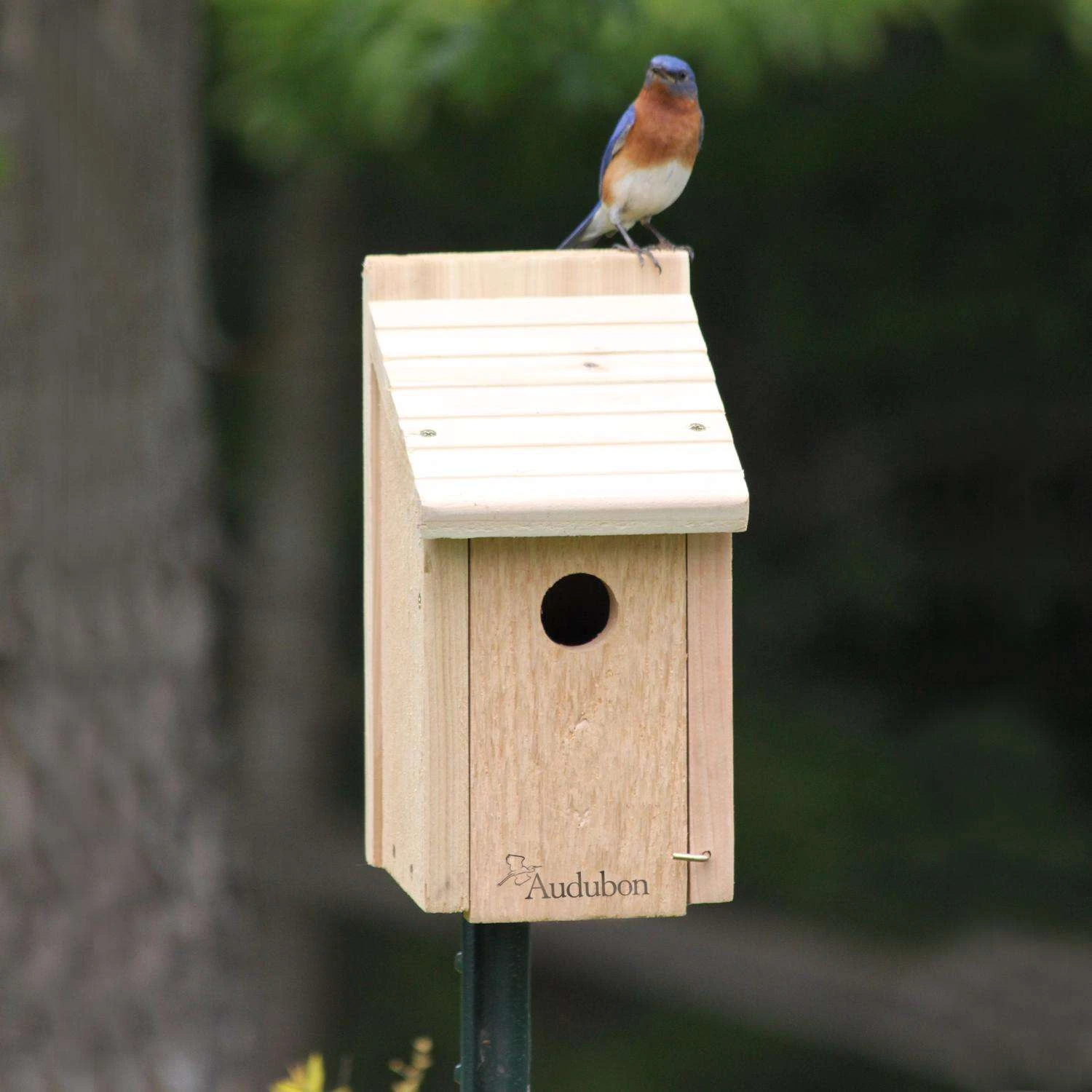 This cedar bluebird house is field tested and approved by the National Audubon Society . Constructed of durable cedar it is both weather resistant and insect repelling. Assembled with rust resistant zinc chromate screws (not nails) to withstand temperature changes. Ideal for the Eastern, Western and Mountain Bluebird. Designed with a 1-9/16” entrance hole it is especially attractive to the eastern bluebird. Built with a 5″ x 5″ base and a 1-9/16″ hole centered 6″ above the floor, the design corresponds with optimum bluebird dimensions. Featuring an easy open front panel, front slides down for checking the progress of nesting birds without disturbing them and for quick and easy cleaning. A 1/2″ air ventilation gap is provided at the top as well as a drain hole at the base. Specifically designed entrance holes discourages other unwanted species from invading the nesting area. Fully assembled and ready to mount. Easy clean out access Ready to mount High quality material